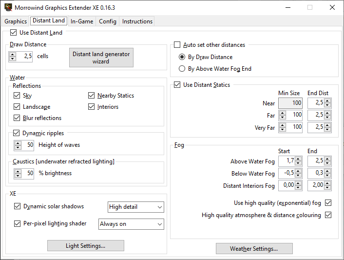 Now that you are back on the **Distant Land** tab you will see all previously unavailable options are now enabled. To get you started, I recommend you copy the settings as shown in the image below. These draw distance settings will preserve the foggy aesthetic of vanilla Morrowind, which I recommend over the absurd draw distance seen in most modern Morrowind screenshots. If you are aching for a little bit of extra draw distance, I suggest increasing the **Draw Distance** to 5,0, and cranking up the **Above Water Fog** settings to Start 3,0 and End 5,0